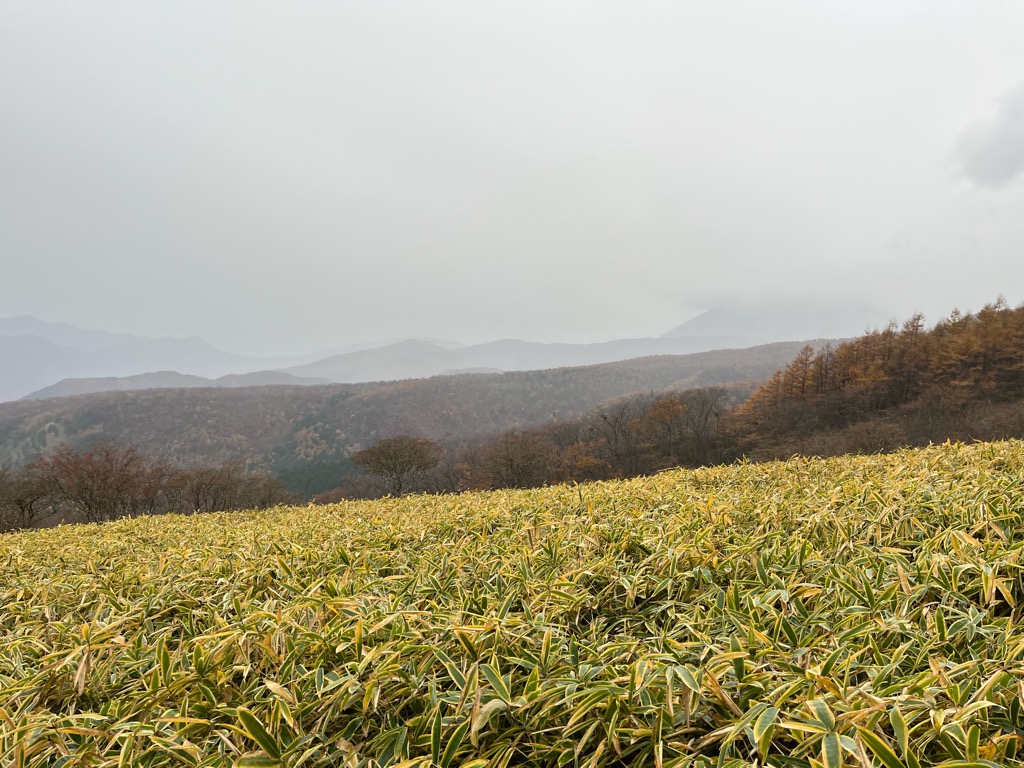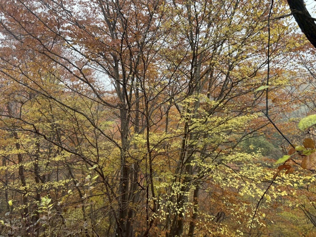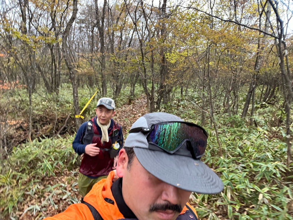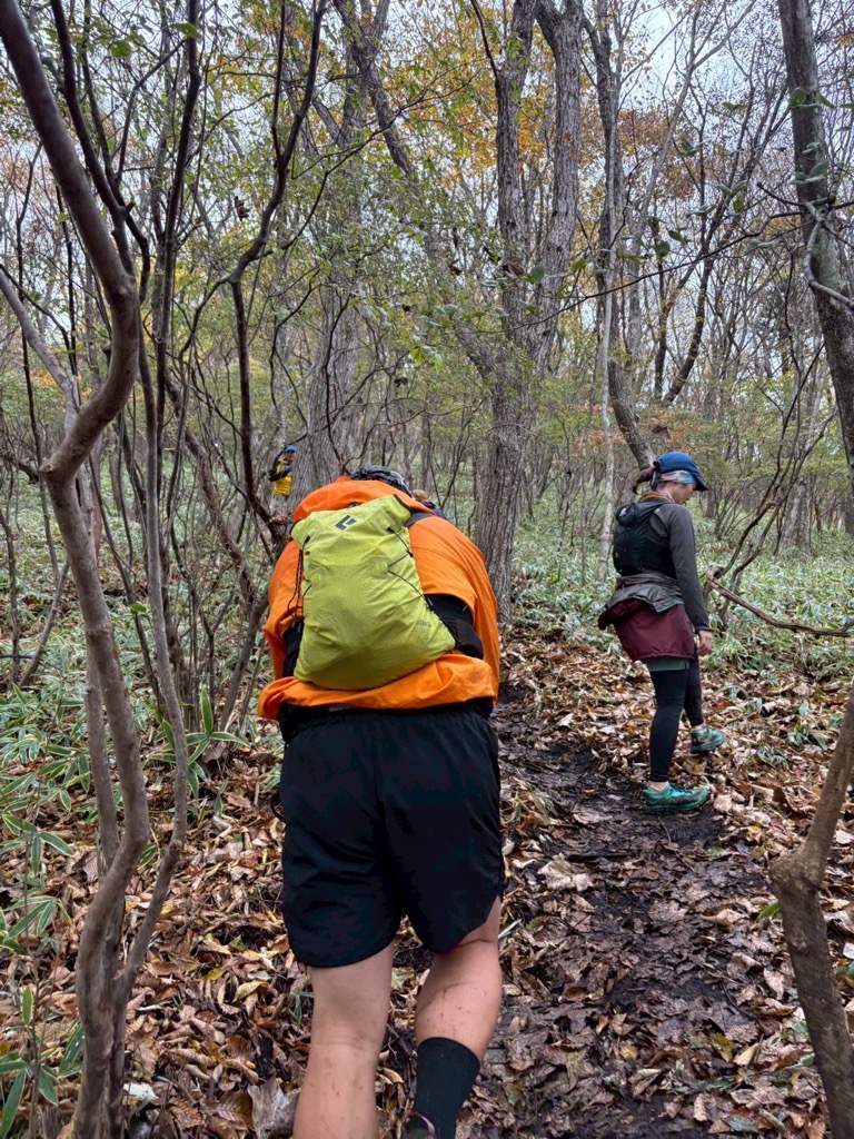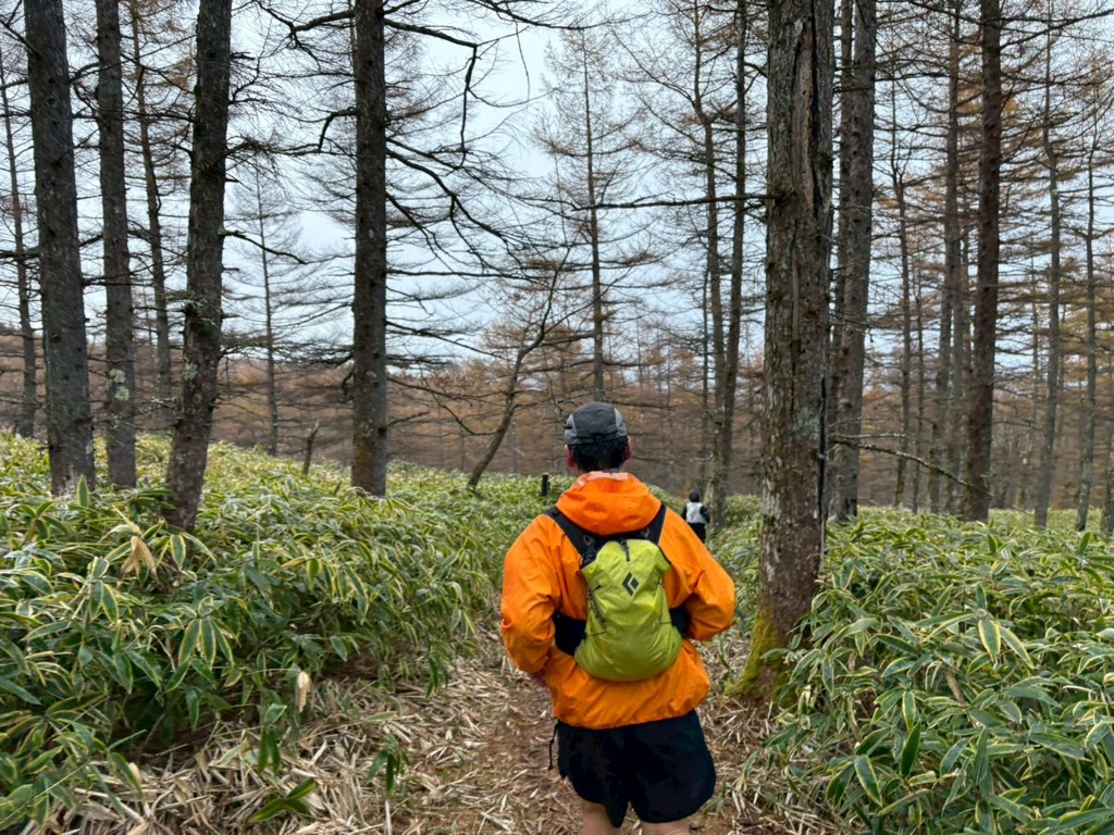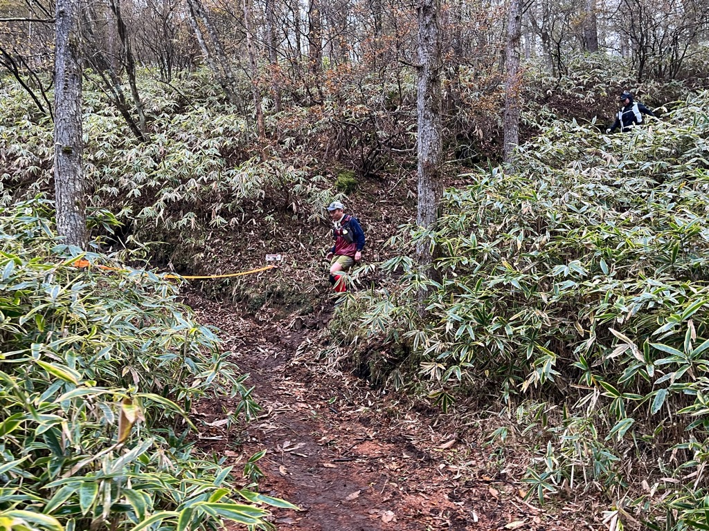 背の低い木が密集するトレイルを通過すると、遠くから法螺貝の音が聞こえる…。