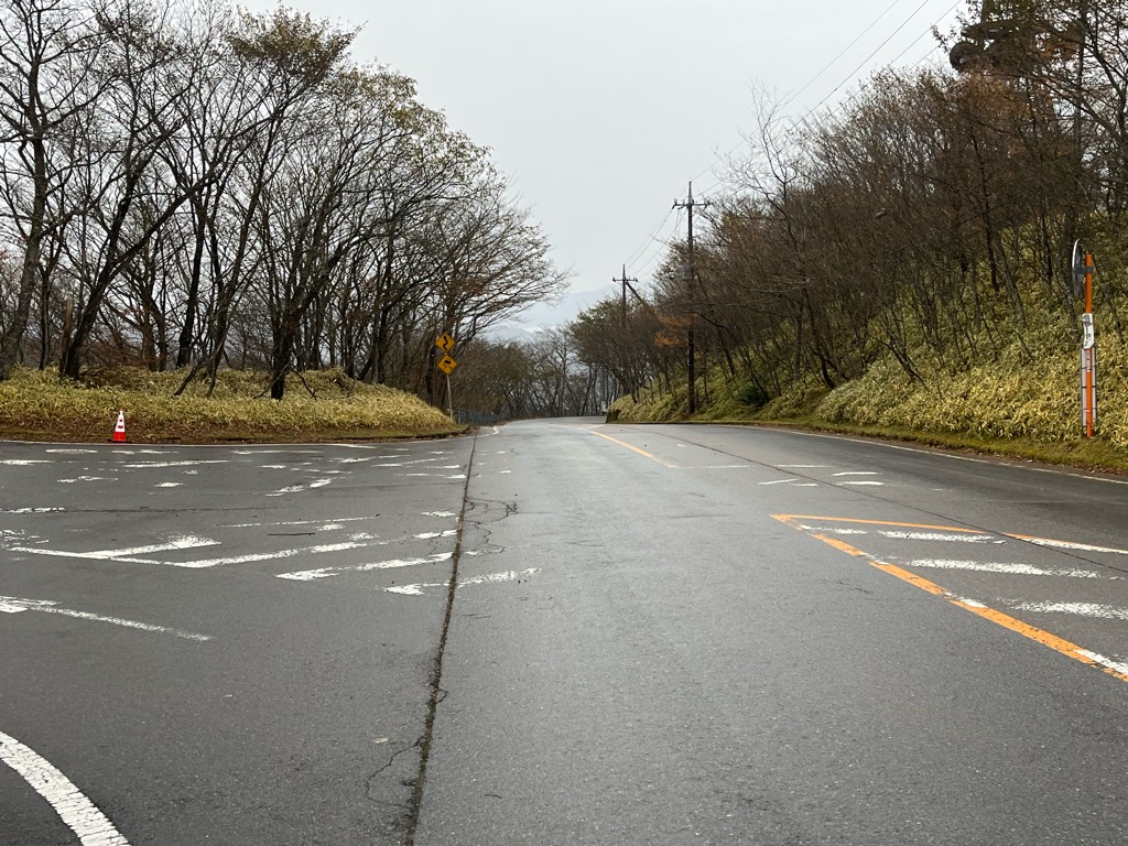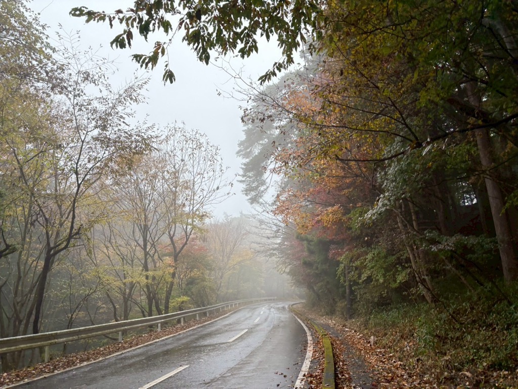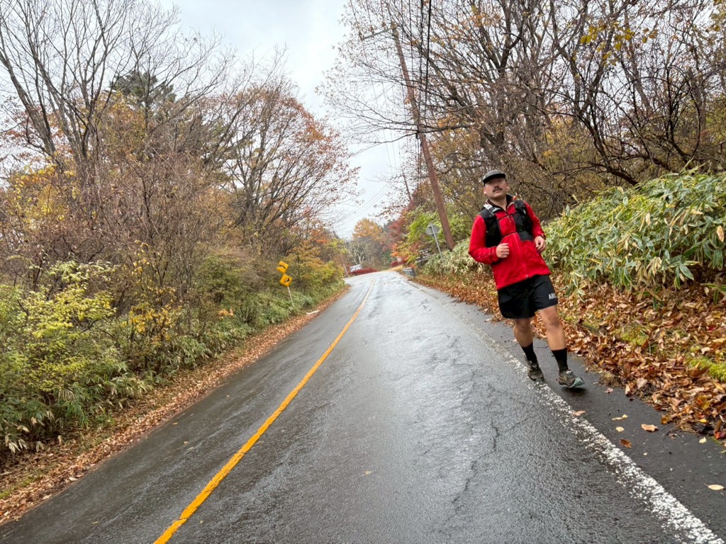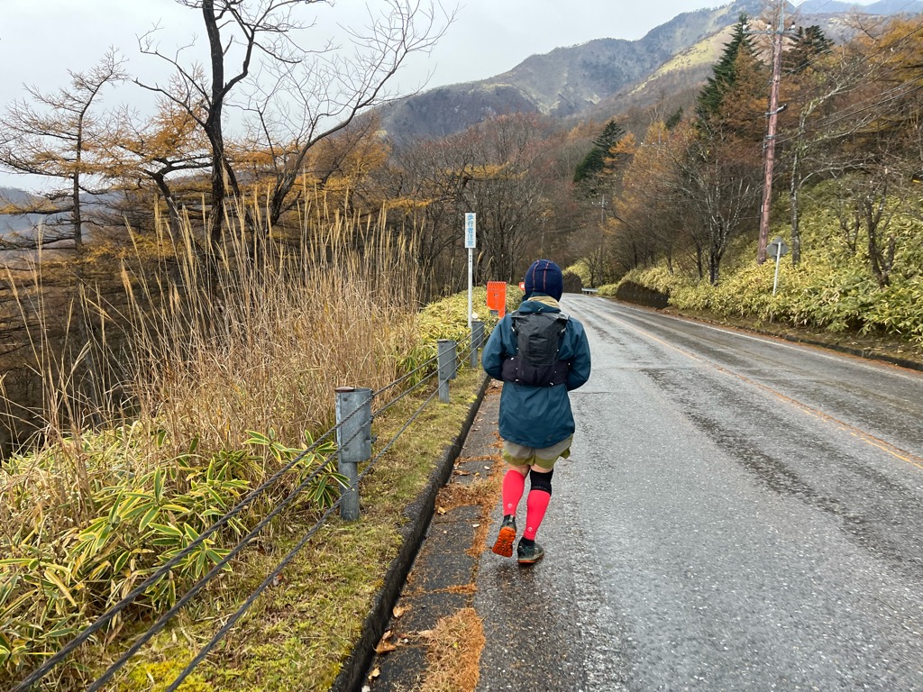 小雨が降る中、下りの舗装路をザクザクと進む。
